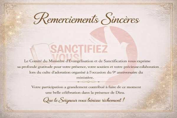 Le Comité du Ministère d'Évangélisation et de Sanctification vous exprime sa profonde gratitude pour votre présence, votre soutien et votre précieuse collaboration lors du culte d'adoration organisé à l'occasion du 9ème anniversaire de Sanctifiez-vous. Votre participation a grandement contribué à faire de ce moment une belle célébration dans la présence de Dieu. Que Le Seigneur... Lire la Suite →