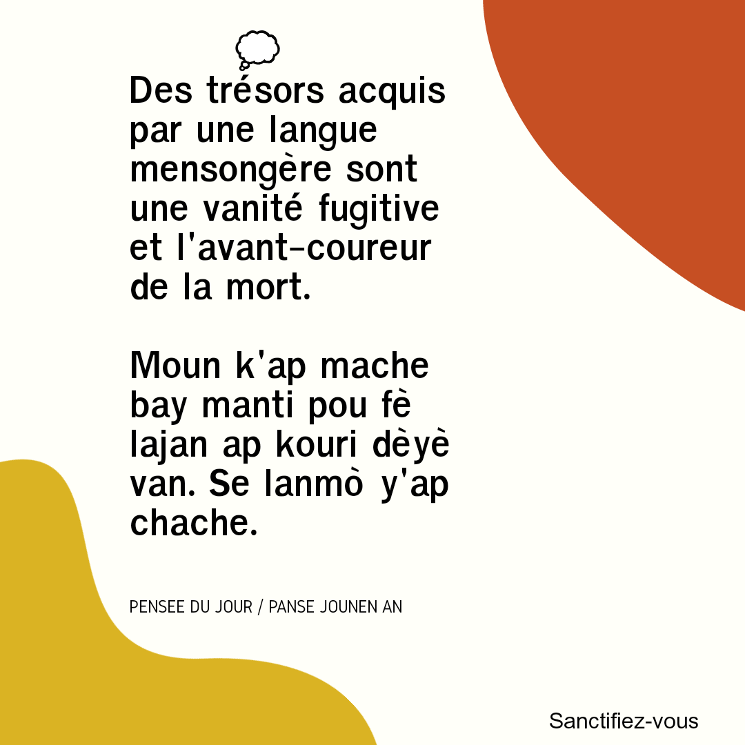 Des trĂ©sors acquis par une langue mensongĂšre Sont une vanitĂ© fugitive et l’avant-coureur de la mort. Proverbes 21:6
