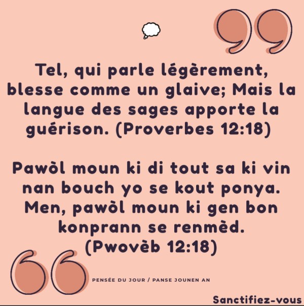 Tel, qui parle légèrement, blesse comme un glaive; Mais la langue des sages apporte la guérison. Proverbes 12:18 Pawòl moun ki di tou sa ki vin nan bouch yo se kout ponya. Men, pawòl moun ki gen bon konprann se renmèd. Pwovèb 12:18 22 / 10 / 2019