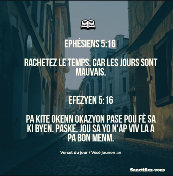 Ephésiens 5:16 Rachetez le temps, car les jours sont mauvais. Efezyen 5:16 Pa kite okenn okazyon pase pou fè sa ki byen. Paske, jou sa yo n'ap viv la a pa bon menm. 22 / 10 / 2019
