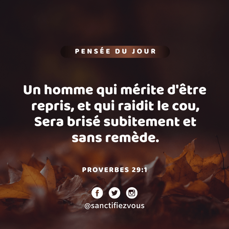 Un homme qui mĂ©rite d’ĂȘtre repris, et qui raidit le cou, Sera brisĂ© subitement et sans remĂšde. Proverbes 29:1