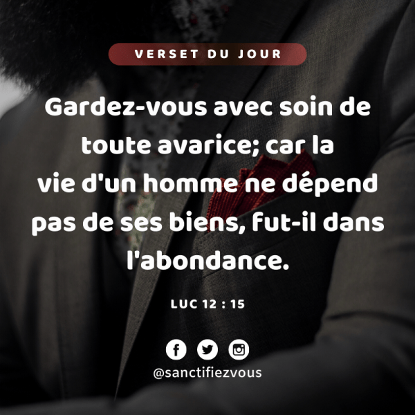 Gardez-vous avec soin de toute avarice; car la vie d'un homme ne dépend pas de ses biens, fût-il dans l'abondance. Luc 12:15 Fè atansyon. Veye kò nou pou lajan pa pran tèt nou. Paske, se pa anpil byen ki garanti lavi yon nonm, li te mèt rich kont kò li. Lik 12:15