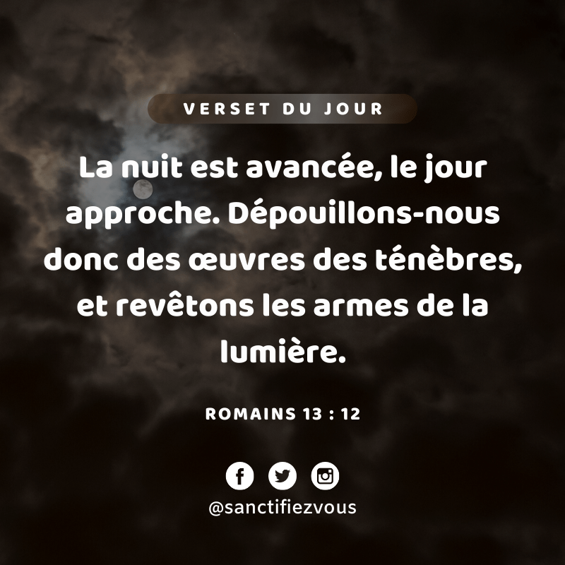 La nuit est avancĂ©e, le jour approche. DĂ©pouillons-nous donc des oeuvres des tĂ©nĂšbres, et revĂȘtons les armes de la lumiĂšre. Romains 13:12