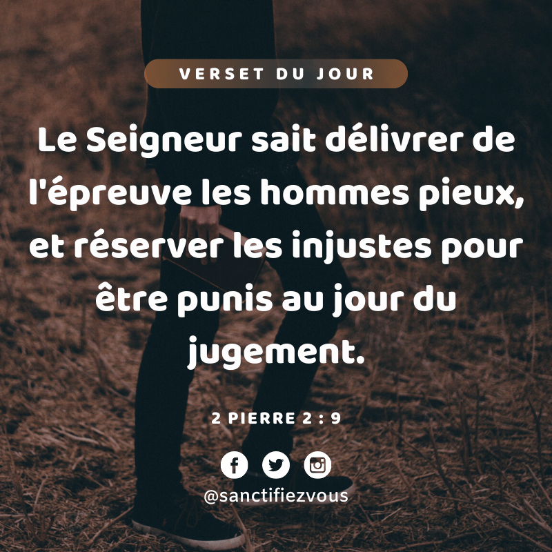 Le Seigneur sait dĂ©livrer de l’Ă©preuve les hommes pieux, et rĂ©server les injustes pour ĂȘtres punis au jour du jugement. 2 Pierre 2:9