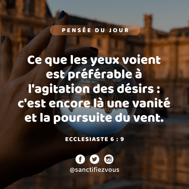 Ce que les yeux voient est prĂ©fĂ©rable Ă l’agitation des dĂ©sirs: c’est encore lĂ une vanitĂ© et la poursuite du vent. EcclĂ©siastes 6:9