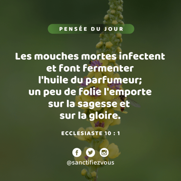 Les mouches mortes infectent et font fermenter l'huile du parfumeur; un peu de folie l'emporte sur la sagesse et sur la gloire. Ecclésiastes 10:1 Mouch mouri gate tout boutèy odè. Yo fè l' santi. Konsa tou, yon sèl ti betiz ka fè tout gwo konesans ou pase pou anyen. Sa ka fè moun pa respekte... Lire la Suite →