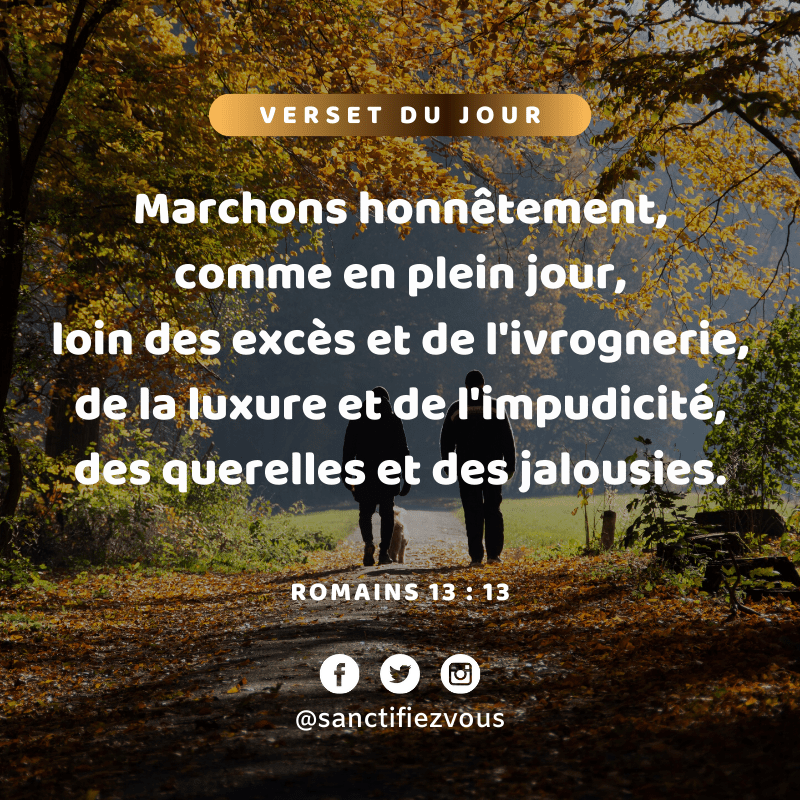 Marchons honnĂȘtement, comme en plein jour, loin des excĂšs et de l’ivrognerie, de la luxure et de l’impudicitĂ©, des querelles et des jalousies. Romains 13:13