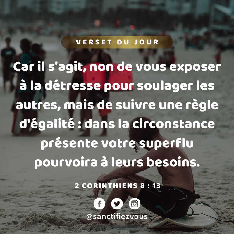 Car il s’agit, non de vous exposer Ă la dĂ©tresse pour soulager les autres, mais de suivre une rĂšgle d’Ă©galitĂ©: dans la circonstance prĂ©sente votre superflu pourvoira Ă leurs besoins. 2 Corinthiens 8:13