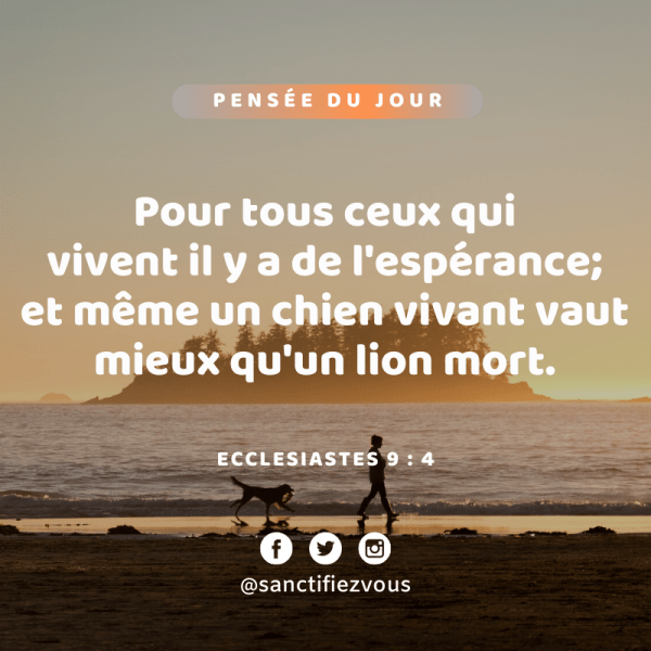 Pour tous ceux qui vivent il y a de l'espérance; et même un chien vivant vaut mieux qu'un lion mort. Ecclésiastes 9:4 Men, toutotan yon moun vivan toujou gen espwa pou li. Yon chen vivan miyò pase yon lyon mouri. Eklezyas 9:4