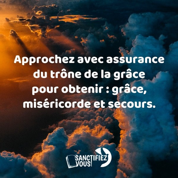 Sanctifiez-vous Sans la SANCTIFICATION, personne ne verra Le Seigneur (Hébreux 12 v.14) Méditation du jour. Sujet : Le trône de la grâce. 🎶[Écouter] Verset : Hébreux 4:16 - Approchons-nous donc avec assurance du trône de la grâce afin d'obtenir miséricorde et de trouver grâce, pour être secourus dans nos besoins. Leçon : Le plus grand... Lire la Suite →