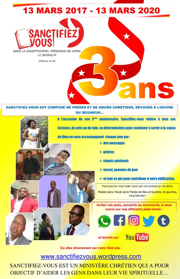 A l’occasion de son 3ème anniversaire, Sanctifiez-vous réitère à tous ses lecteurs, de près ou de loin, sa détermination pour continuer à servir à la cause de Dieu en vous accompagnant chaque jour par des :