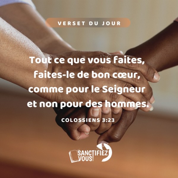 Tout ce que vous faites, faites-le de bon cœur, comme pour le Seigneur et non pour des hommes. Colossiens 3:23Vèsè jounen an📖.Nenpòt travay yo ban nou fè, fè l ak tout kè nou tankou si se pa pou lèzòm nou t'ap travay, men pou Sènyè a. Kolosyen 3:23