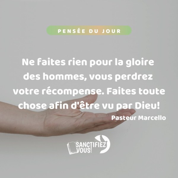 Ne faites rien pour la gloire des hommes, vous perdrez votre récompense. Faites toute chose afin d'être vu par Dieu. Pasteur MarcelloPanse pou jounen an 🧠.Pinga ou fè anyen pou lèzom ka fè lwanj pou ou, sinon, w'ap pèdi rekonpans ou. Men pito, fè tout bagay pou se BonDye ki wè w. Pastè Marcello