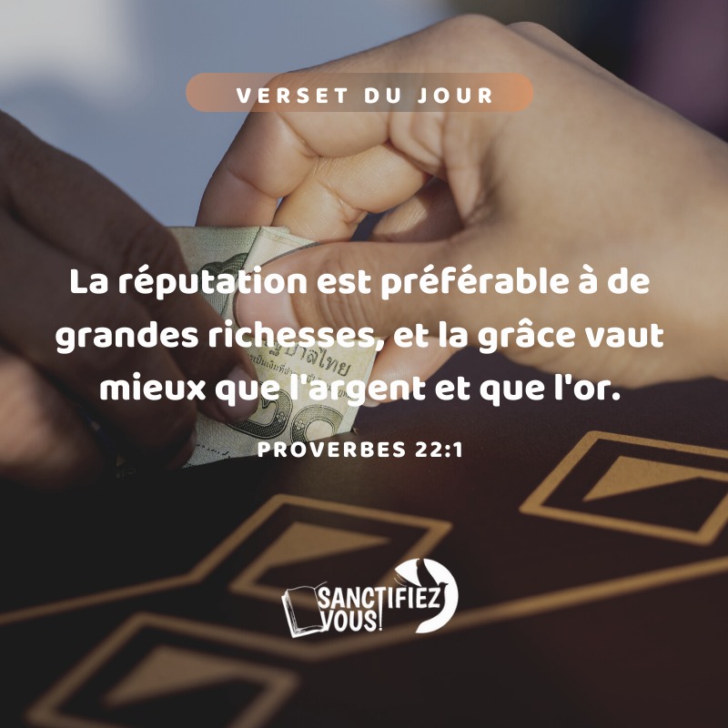 La rĂ©putation est prĂ©fĂ©rable Ă de grandes richesses, et la grĂące vaut mieux que l’argent et que l’or. Proverbes 22:1