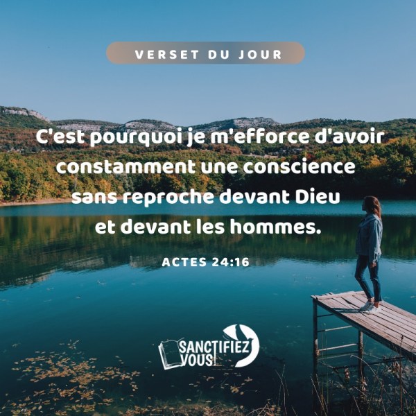 C'est pourquoi je m'efforce d'avoir constamment une conscience sans reproche devant Dieu et devant les hommes. Actes 24:16 Vèsè jounen an 📖. Se poutèt sa, mwen menm tou ap fòse pou mwen toujou genyen yon konsyans ki san repwòch devan BonDye ak devan lèzòm. Tavay 24:16