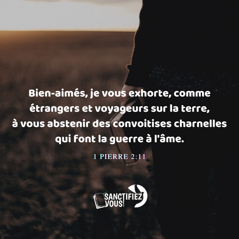 Bien-aimés, je vous exhorte, comme étrangers et voyageurs sur la terre, à vous abstenir des convoitises charnelles qui font la guerre à l’âme. 1 Pierre 2:11