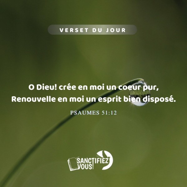 O Dieu! crée en moi un cœur pur, renouvelle en moi un esprit bien disposé. Psaumes 51:12Vèsè jounen an 📖O BonDye! pa kite okenn move lide nan kè m'. Mete bon lide nan tèt mwen, pou m' sa kenbe fèm. Sòm 51:12