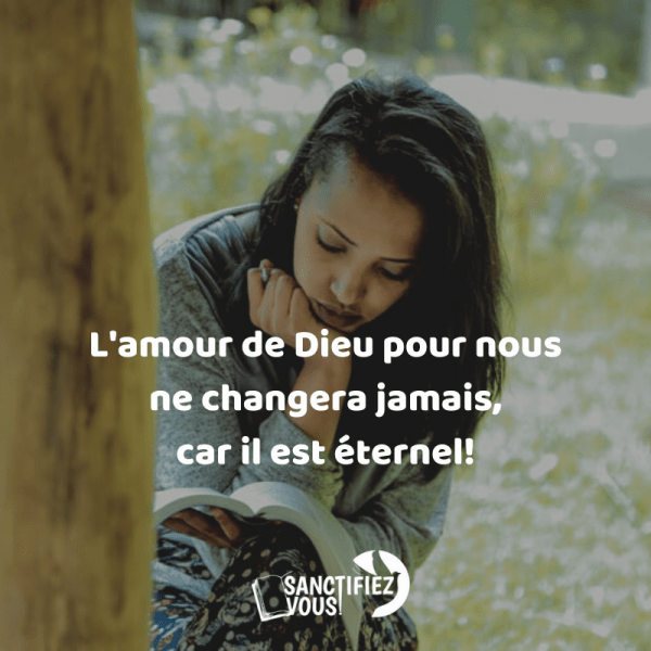 Sanctifiez-vousSans la SANCTIFICATION, personne ne verra Le Seigneur (Hébreux 12 v.14)Méditation spéciale cette semaine sur les caractéristiques de l'amour de Dieu.Sujet : L'amour de Dieu est infaillible.🎶[Écouter]Verset : Psaumes 23:6 - Oui, toute ma vie, Ta bonté et Ton amour m'accompagneront [...] (Vers. Semeur)Leçon : Lorsque le péché nous avait séparé de Dieu, Dieu Lui-même... Lire la Suite →