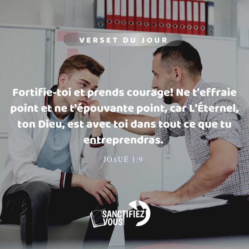 Fortifie-toi et prends courage! Ne t’effraie point et ne t’Ă©pouvante point, car L’Ăternel, Ton Dieu, est avec toi dans tout ce que tu entreprendras. JosuĂ© 1:9
