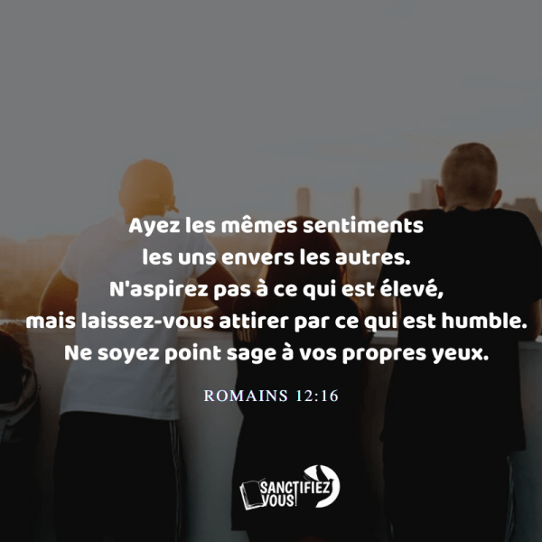 Ayez les mêmes sentiments les uns envers les autres. N'aspirez pas à ce qui est élevé, mais laissez-vous attirer par ce qui est humble. Ne soyez point sages à vos propres yeux. Romains 12:16 Bien aimé(é), ne soyez pas orgueilleux, contrôlez vos prétentions; et surtout, que vos sentiments soient toujours purs et justes envers tous,... Lire la Suite →