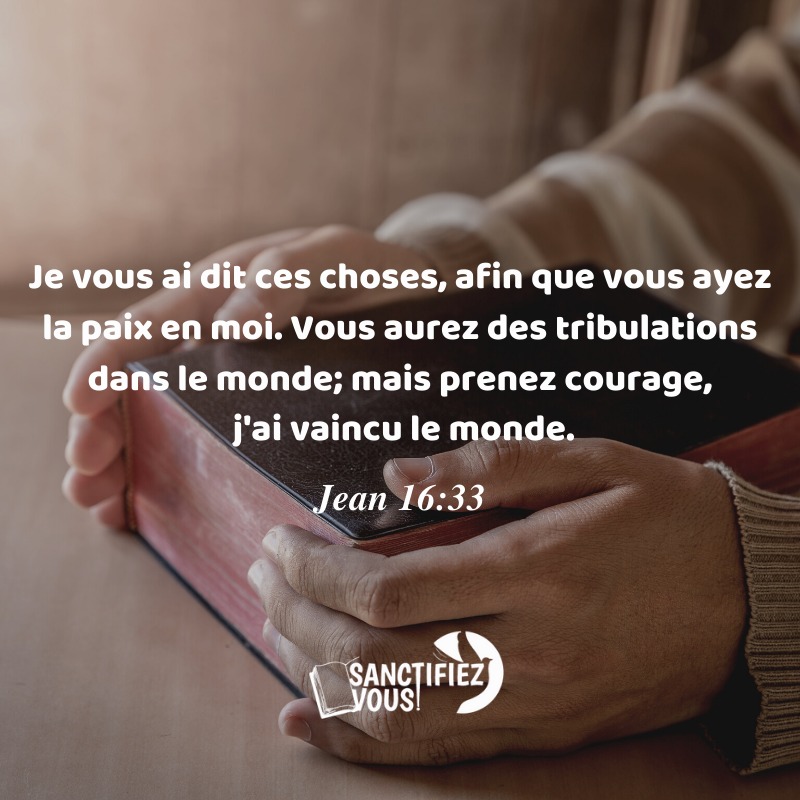 Je vous ai dit ces choses, afin que vous ayez la paix en moi. Vous aurez des tribulations dans le monde; mais prenez courage, J’ai vaincu le monde. Jean 16:33