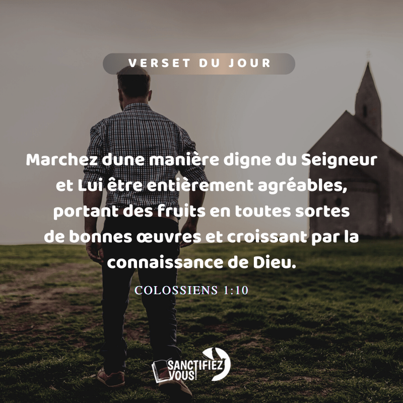Marchez d’une maniĂšre digne du Seigneur et Lui ĂȘtre entiĂšrement agrĂ©ables, portant des fruits en toutes sortes de bonnes Ćuvres et croissant par la connaissance de Dieu. Colossiens 1:10