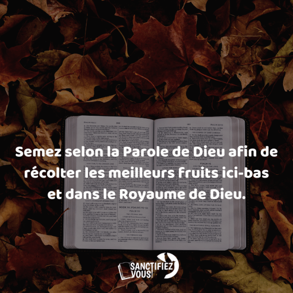 Sanctifiez-vousSans la SANCTIFICATION, personne ne verra Le Seigneur (Hébreux 12 v.14) Méditation spéciale cette semaine sur la loi spirituelle de la semence et de la moisson. Sujet : Semez selon la Parole de Dieu.🎶[Écouter]Verset : Josué 1:8 - Que ce livre de la loi ne s'éloigne point de ta bouche; médite-le jour et nuit, pour... Lire la Suite →
