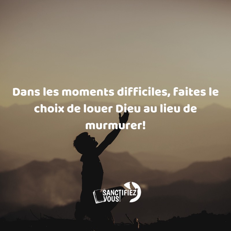 Conseils : Pratiquez votre foi en faisant confiance à Dieu dans vos moments de détresse; et à chaque fois que l’idée ou l’envie de murmurer vous viendra en tête, louez Dieu pour tout ce qu’Il a déjà accompli dans votre vie.