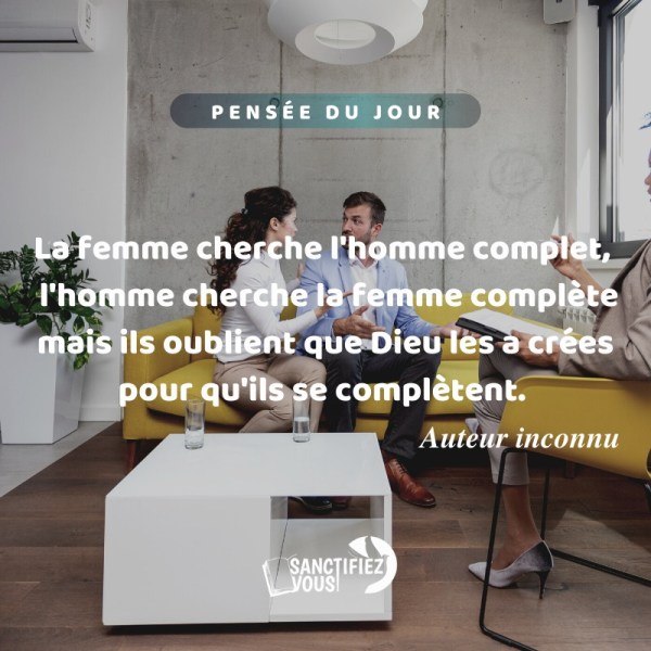 La femme cherche l'homme complet, l'homme cherche la femme complète mais ils oublient que Dieu les a crées pour qu'ils se complètent. Auteur inconnu Panse pou jounen an 🧠Fanm nan ap chèche yon bon gason ki pa gen defo, gason an ap chèche yon bon fanm ki pa gen defo, men yo bliye ke BonDye... Lire la Suite →