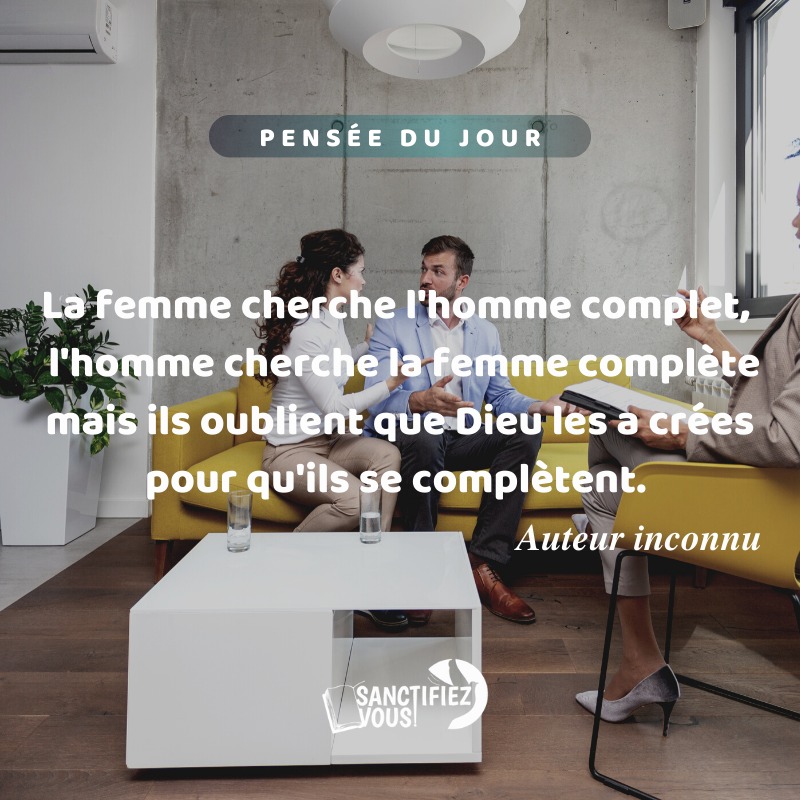 La femme cherche l’homme complet, l’homme cherche la femme complĂšte mais ils oublient que Dieu les a crĂ©es pour qu’ils se complĂštent. Auteur inconnu