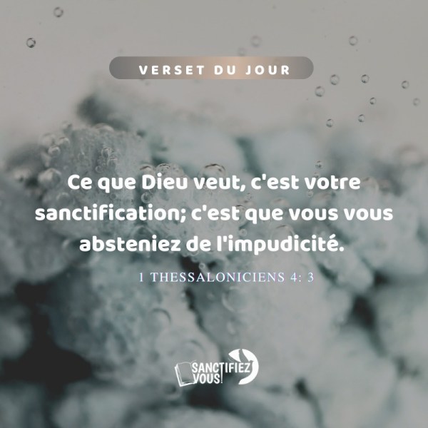 Ce que Dieu veut, c'est votre sanctification; c'est que vous vous absteniez de l'impudicité. 1 Thessaloniciens 4:3 Vèsè jounen an 📖Men sa BonDye vle pou nou : se pou nou viv apa pou BonDye, pou nou pa lage kò nou nan imoralite. 1 Tesalonik 4:3