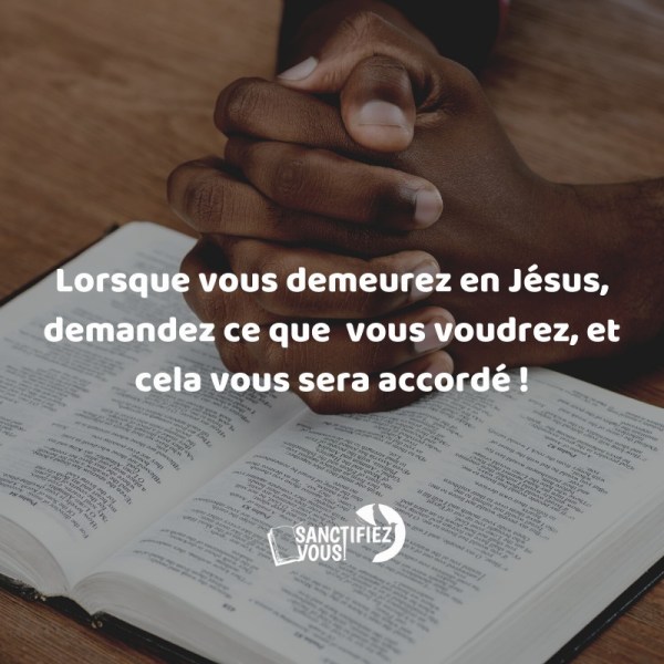 Sanctifiez-vousSans la SANCTIFICATION, personne ne verra Le Seigneur (Hébreux 12 v.14) Méditation du jour Sujet : Demeurez en Jésus.🎶[Écouter]Verset : Jean 15:7 - Si vous demeurez en Moi, et que Mes paroles demeurent en vous, demandez ce que vous voudrez, et cela vous sera accordé. Leçon : Dans ce verset, Jésus s’adressa à Ses disciples... Lire la Suite →
