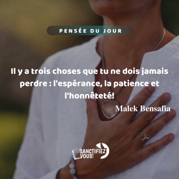 Il y a trois choses que tu ne dois jamais perdre : l'espérance, la patience et l'honnêteté. Malek Bensafia Panse pou jounen an 🧠Gen twa bagay ou pa ta dwe janm pèdi: espwa, pasyans, ak onètete. Malek Bensafia