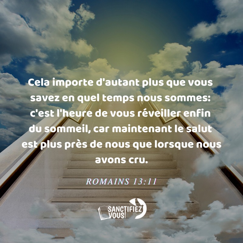 Cela importe d’autant plus que vous savez en quel temps nous sommes: c’est l’heure de vous réveiller enfin du sommeil, car maintenant le salut est plus près de nous que lorsque nous avons cru. Romains 13:11