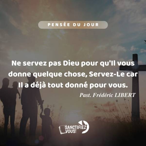Ne servez pas Dieu pour qu'Il vous donne quelque chose, servez-Le car Il a déjà tout donné pour vous. Past. Frédéric LIBERT Panse pou jounen anPa sèvi BonDye pou Li ka ba w' yon bagay, sèvi L' paske Li gentan bay tout bagay pou ou deja. Past. Frédéric LIBERT