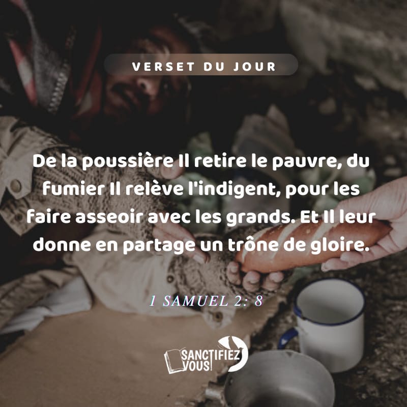 De la poussiĂšre Il retire le pauvre, du fumier Il relĂšve l’indigent, pour les faire asseoir avec les grands. Et Il leur donne en partage un trĂŽne de gloire. 1 Samuel 2:8