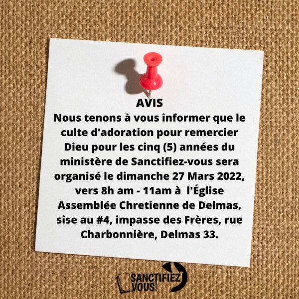 Nous tenons à vous informer que le culte d'adoration pour remercier Dieu pour les cinq (5) années du ministère de Sanctifiez-vous sera organisé le dimanche 27 Mars 2022, vers 8h am - 11am à l'Église Assemblée Chretienne de Delmas, sise au 4, impasse des Frères, rue Charbonnière, Delmas 33. Venez remercier Dieu avec l'équipe de... Lire la Suite →