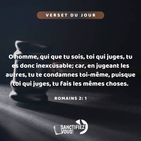 O homme, qui que tu sois, toi qui juges, tu es donc inexcusable; car, en jugeant les autres, tu te condamnes toi-même, puisque toi qui juges, tu fais les mêmes choses. Romains 2:1 Vèsè jounen an 📖Monchè, nenpòt sa ou ye, ou menm k'ap jije lòt moun yo, ou pa gen eskiz. Ou menm k'ap... Lire la Suite →