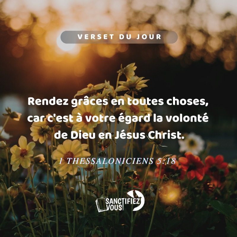 Rendez grĂąces en toutes choses, car c’est Ă votre Ă©gard la volontĂ© de Dieu en JĂ©sus Christ. 1 Thessaloniciens 5:18