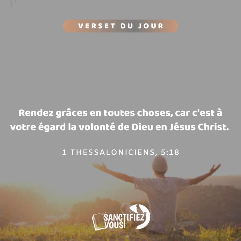 Rendez grĂąces en toutes choses, car c’est Ă votre Ă©gard la volontĂ© de Dieu en JĂ©sus Christ. 1 Thessaloniciens 5:18