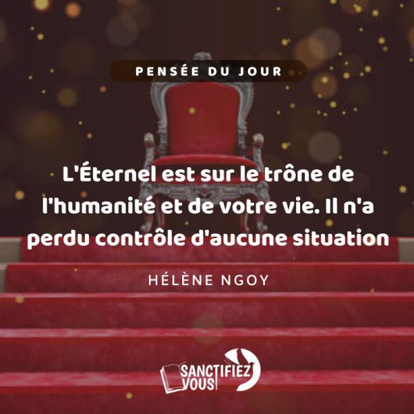 L'Éternel est sur le trône de l'humanité et de votre vie. Il n'a perdu contrôle d'aucune situation. Hélène NGOY Panse pou jounen anSenyè a chita sou fotèy mond lan ak sou lavi w. Li pa pèdi kontwòl ankenn sitiyasyon. Hélène NGOY