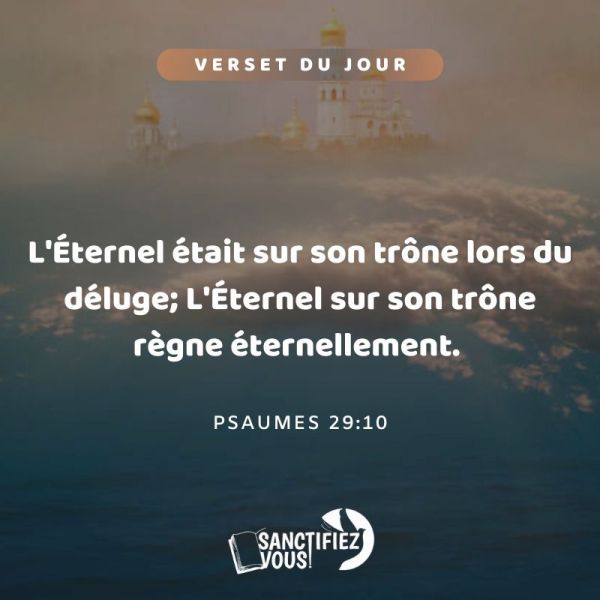 L'Éternel était sur son trône lors du déluge; L'Éternel sur son trône règne éternellement. Psaumes 29:10 Vèsè jounen an 📖Senyè a te chita sou fotèy Li lè te gen gwo inondasyon an. L'ap gouvènen tankou wa pou tout tan. Sòm 29:10