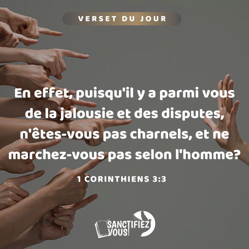 En effet, puisqu’il y a parmi vous de la jalousie et des disputes, n’ĂȘtes-vous pas charnels, et ne marchez-vous pas selon l’homme ? 1 Corinthiens 3:3
