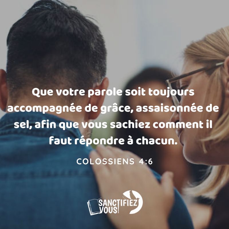 Que votre parole soit toujours accompagnée de grâce, assaisonnée de sel, afin que vous sachiez comment il faut répondre à chacun. Colossiens 4:6
