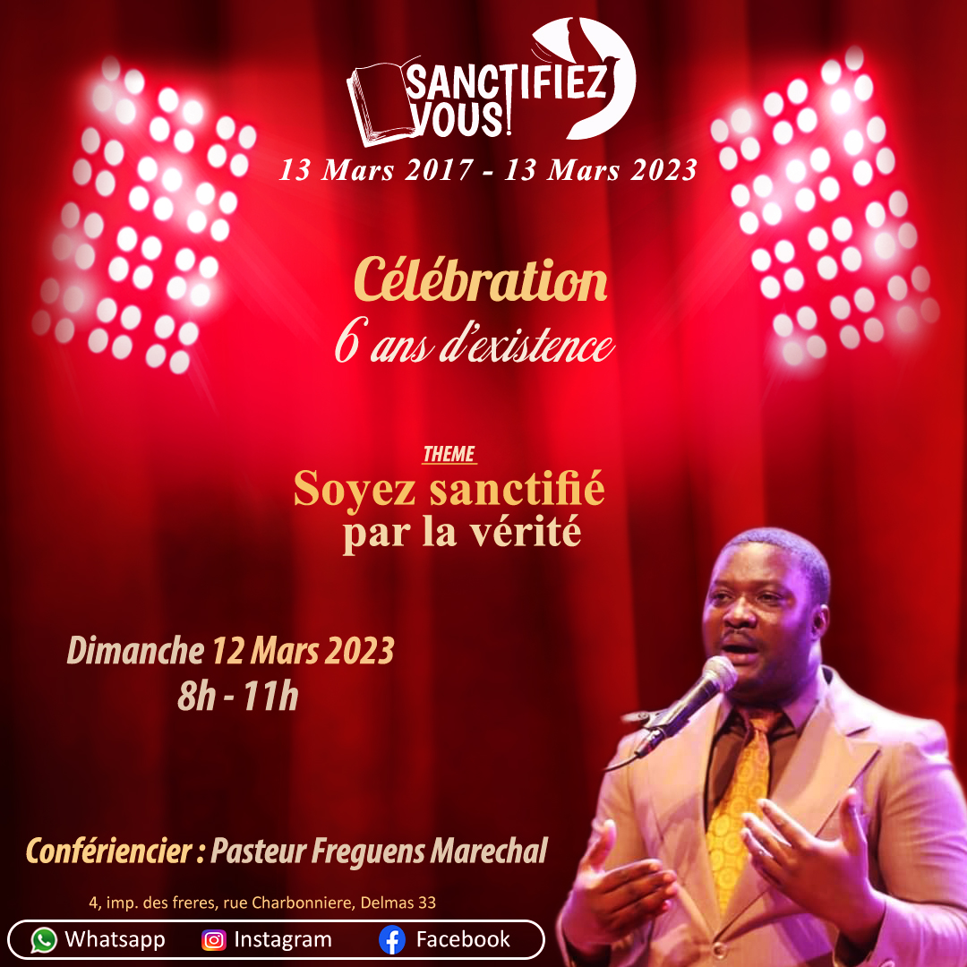 13 Mars 2023 marquera la 6ème année d’existence du ministère Sanctifiez-vous. Ainsi, nous vous invitons à venir célébrer et bénir Le Nom de Dieu dans un culte d’adoration avec l’équipe de Sanctifiez-vous le dimanche 12 Mars 2023, de 8h am – 11h am (heure d’Haïti), à l’église Assemblée Chrétienne par la Foi de Delmas, sise au #4, impasse des Frères, rue Charbonnière, Delmas 33.