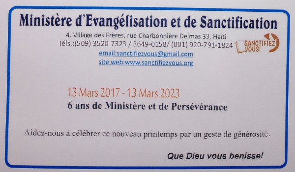 13 Mars 2023 - 6 ans d'existenceSUPPORTVous qui désirez supporter Sanctifiez-vous à l'occasion de son 6ème anniversaire, voici les différents moyens qui sont à votre disposition :1. Prenez une enveloppe si vous êtes proche de l'un des membres de l'équipe Sanctifiez-vous,2. Envoyez votre support via "Mon Cash" sur le numéro : +509 3128 27 53,3.... Lire la Suite →