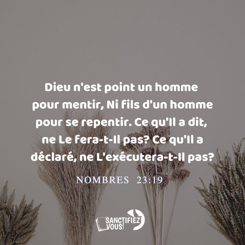 Dieu n’est point un homme pour mentir, ni fils d’un homme pour se repentir. Ce qu’Il a dit, ne Le fera-t-Il pas ? Ce qu’Il a déclaré, ne L’exécutera-t-Il pas ? Nombres 23:19