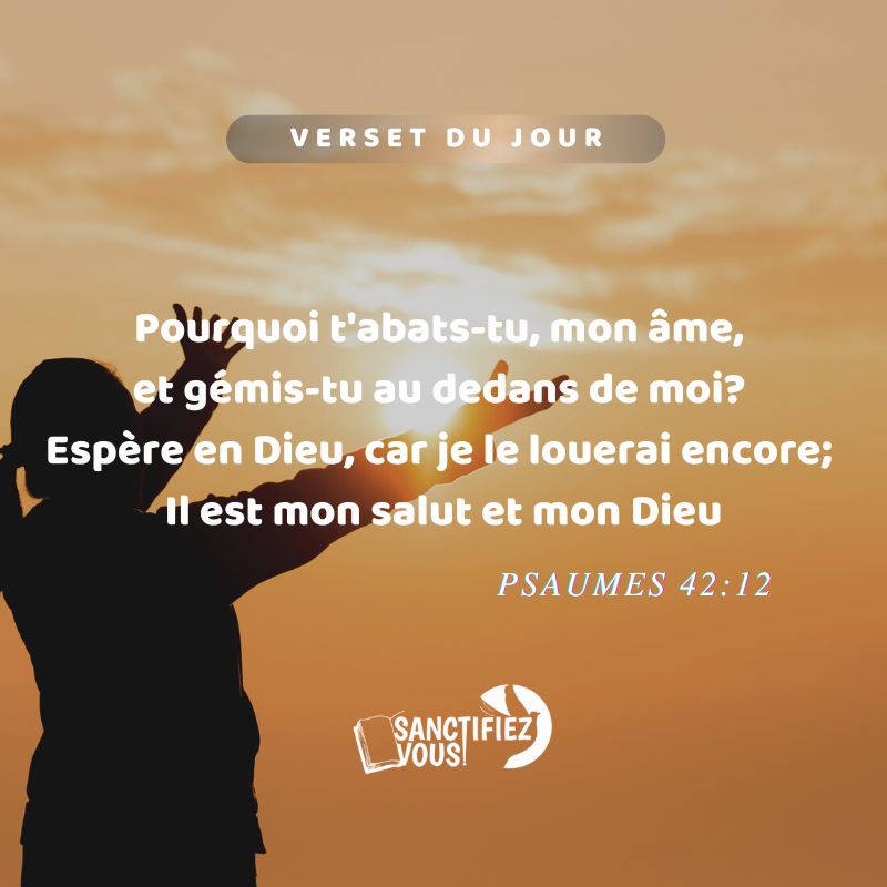 Pourquoi t’abats-tu, mon Ăąme, et gĂ©mis-tu au dedans de moi ? EspĂšre en Dieu, car je Le louerai encore; Il est mon salut et mon Dieu. Psaumes 42:12