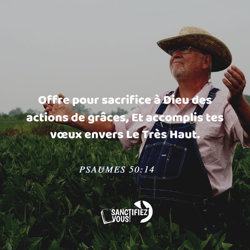 Offre pour sacrifice à Dieu des actions de grâces, et accomplis tes vœux envers Le Très Haut. Psaumes 50:14