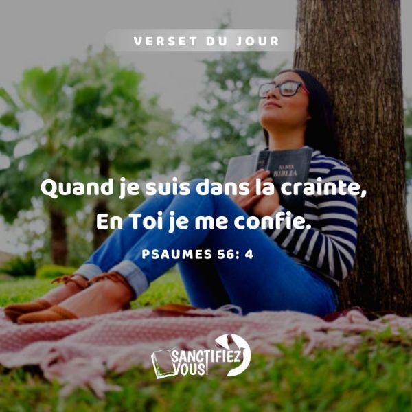 Sanctifiez-vous Quand je suis dans la crainte, En Toi je me confie. Psaumes 56: 4 Vèsè jounen an 📖BonDye ki anwo nan syèl la, lè mwen pè, se nan Ou mwen mete tout konfyans mwen. Sòm 56: 4